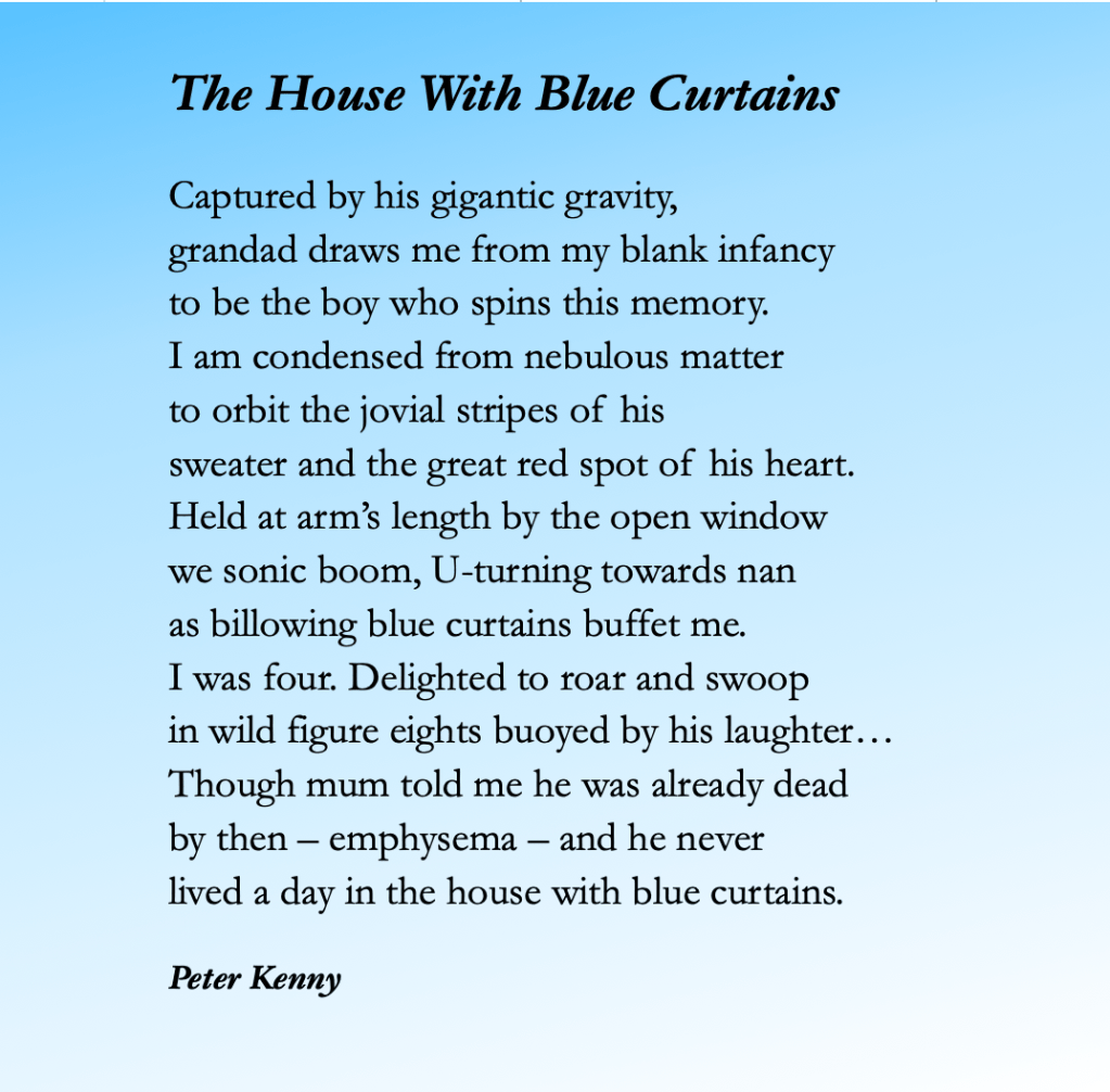 Thanks for dropping by. I’m Peter Kenny, poet and co-host of the Planet Poetry podcast with Robin Houghton. As well as poetry, I also write short dark fiction, comedy plays and more.