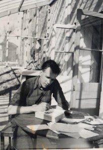 I have been looking at some of Mervyn Peake’s work, and there is a great site here, run by his son Sebastian Peake. I emailed Sebastian to ask for permission to use one of the photos on The Anthology of Guernsey site. Sebastian says this picture is of his father “at work writing Gormenghast in the conservatory of our house on Sark, Le Chalet, in the late 1940s”.