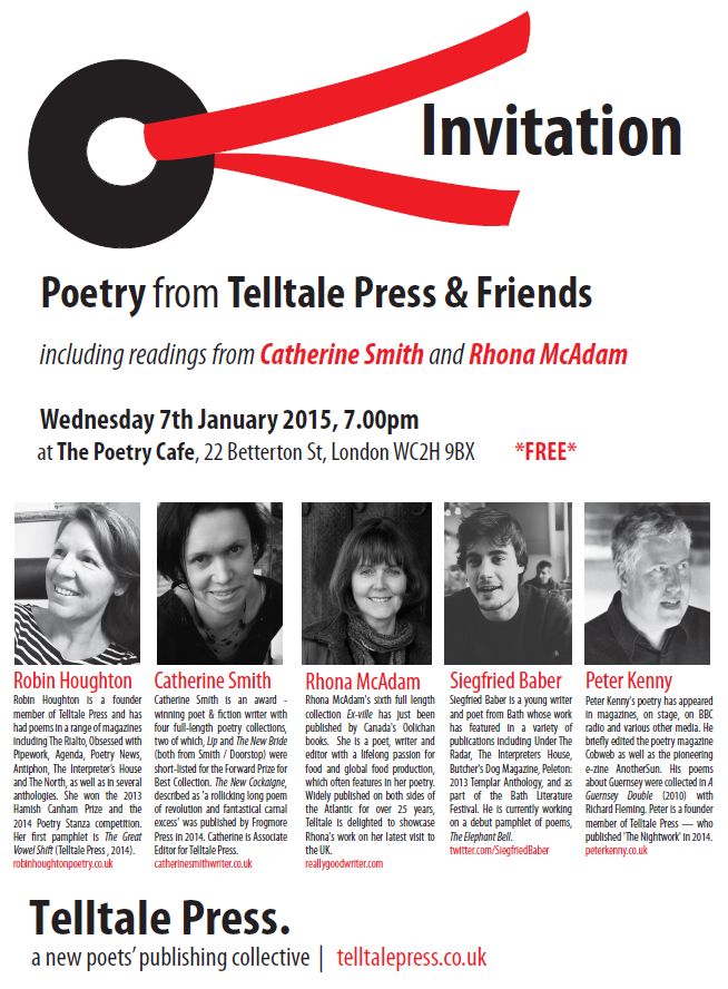 Please come to this reading if you find yourself in spitting distance of central London. For, with no trace at all of post-festive wear, Telltale press and friends will burst from the blocks on Wednesday 7th January, at 7.00pm at the Poetry Cafe, 22 Betterton Street, WC2H 9BX.